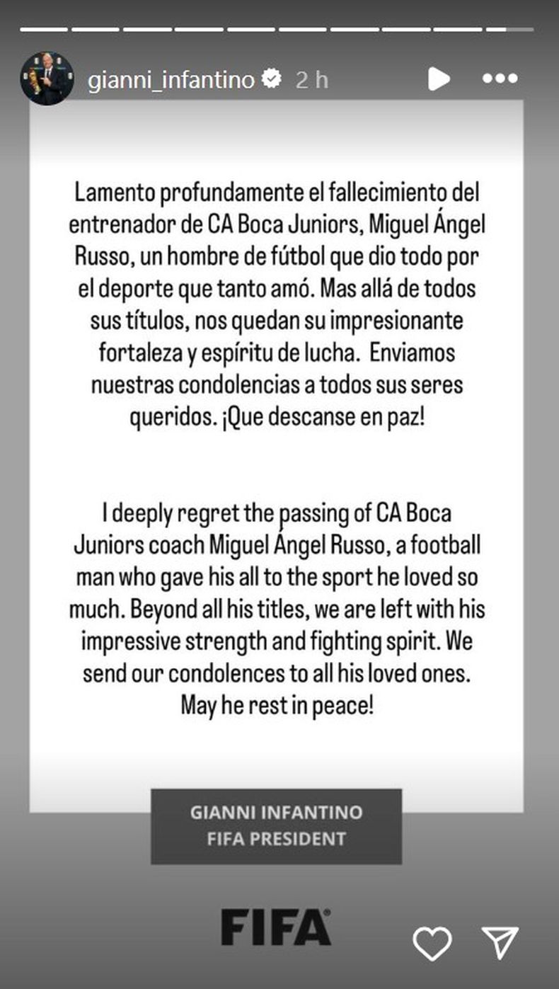 "Agradecemos el afecto y el respeto de todas las personas que se acercaron o estuvieron presentes de corazón en el emotivo adiós de hoy. Toda la comunidad de Boca acompaña a la familia Russo en este momento de dolor. El club permanecerá cerrado por duelo durante 48 horas, con asueto administrativo", continuó el comunicado.