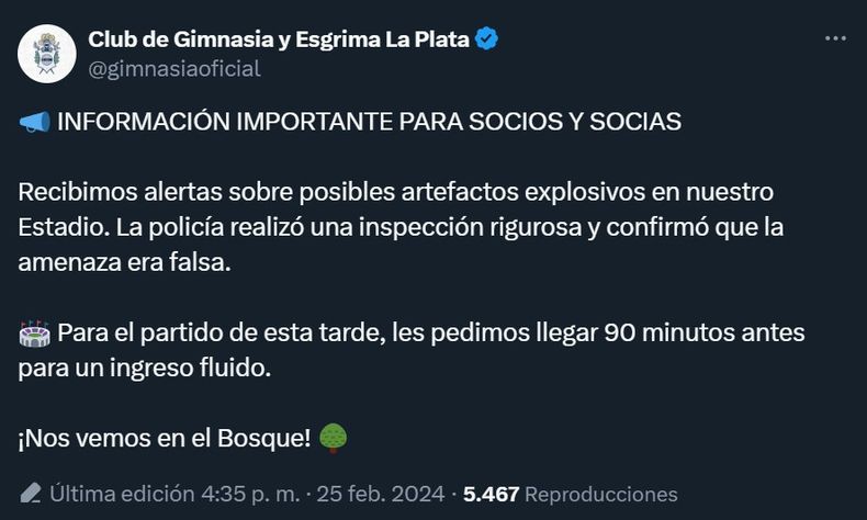 Gimnasia de La Plata informó que tras las amenazas de bomba recibidas antes del partido con Estudiantes, personal de la Policía de la provincia de Buenos Aires inspeccionó el estadio Juan Carmelo Zerillo y descartó la presencia de un artefacto explosivo. Por lo cual, el clásico de la ciudad de las diagonales se jugará -como estaba pautado- a partir de las 19.30.