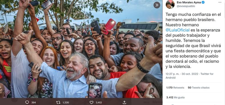 “¡Felicidades hermano! Tu victoria fortalece la democracia y la integración latinoamericana”, escribió acompañado de una imagen del actual mandatario electo y agregó: “Estamos seguros que conducirás al pueblo brasileño por el camino de la paz, el progreso y la justicia social. ¡Jallalla Brasil!”
