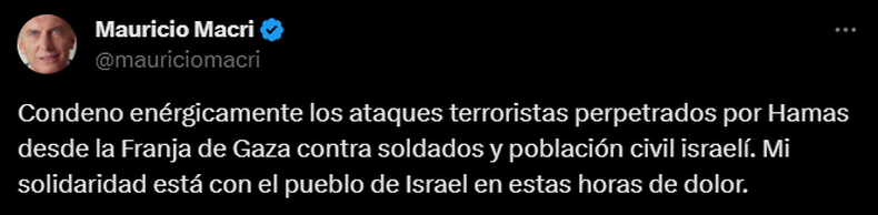 Por su parte, Mauricio Macri se expresó: "Condeno enérgicamente los ataques terroristas perpetrados por Hamás desde la Franja de Gaza contra soldados y población civil israelí. Mi solidaridad está con el pueblo de Israel en estas horas de dolor.