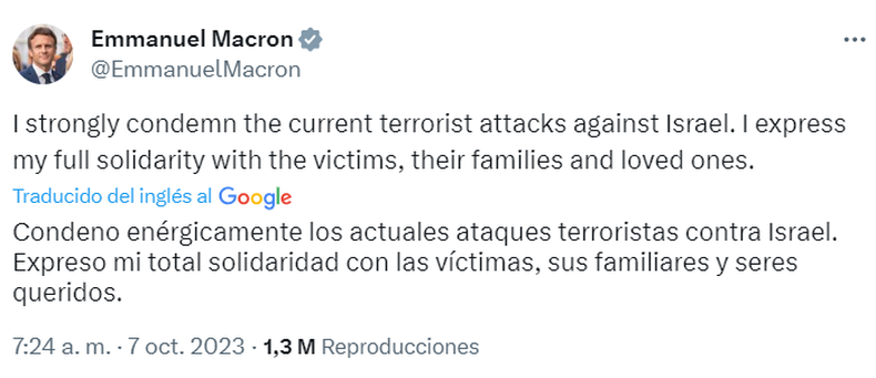 También el presidente de Francia Emmanuel Macron, publicó un mensaje en su cuenta de Twitter donde condenó "enérgicamente los actuales ataques terroristas contra Israel. Expreso mi total solidaridad con las víctimas, sus familiares y seres queridos".