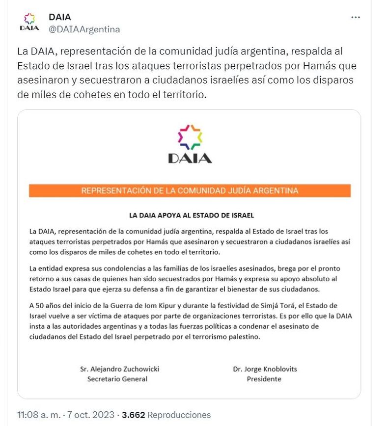"La DAIA, representación de la comunidad judía argentina respalda al Estado de Israel tras los ataques terroristas perpetrados por Hamás que asesinaron y secuestraron a ciudadanos israelíes así como los disparos de miles de cohetes en todo el territorio", expresa el inicio del comunicado que cuenta con las firmas del secretario general Alejandro Zuchowicki y el presidente, Jorge Knoblovits.