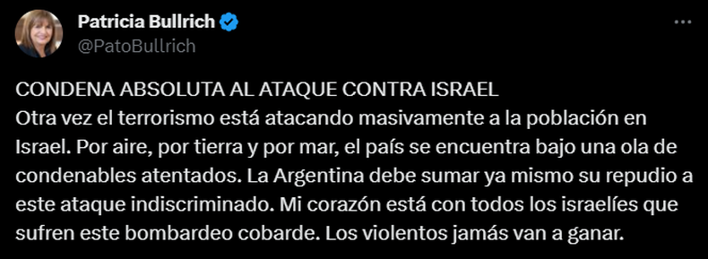 En primer lugar, Patricia Bullrich, expresó: “Otra vez el terrorismo está atacando masivamente a la población en Israel. Por aire, por tierra y por mar, el país se encuentra bajo una ola de condenables atentados. La Argentina debe sumar ya mismo su repudio a este ataque indiscriminado. Mi corazón está con todos los israelíes que sufren este bombardeo cobarde. Los violentos jamás van a ganar”