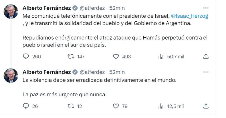 El mandatario argentino informó en sus redes sociales que llamó a Isaac Herzog en medio del conflicto para transmitirle "la solidaridad del pueblo y del Gobierno de Argentina". "Repudiamos enérgicamente el atroz ataque que Hamás perpetuó contra el pueblo israelí en el sur de su país", agregó.