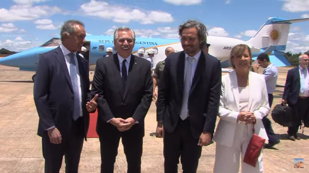 El presidente arribó a Brasilia con una pequeña comitiva integrada por el canciller, Santiago Cafiero; la portavoz presidencial, Gabriela Cerruti; la secretaria de Cambio Climático, Cecilia Nicolini; y el embajador argentino en Brasil, Daniel Scioli.