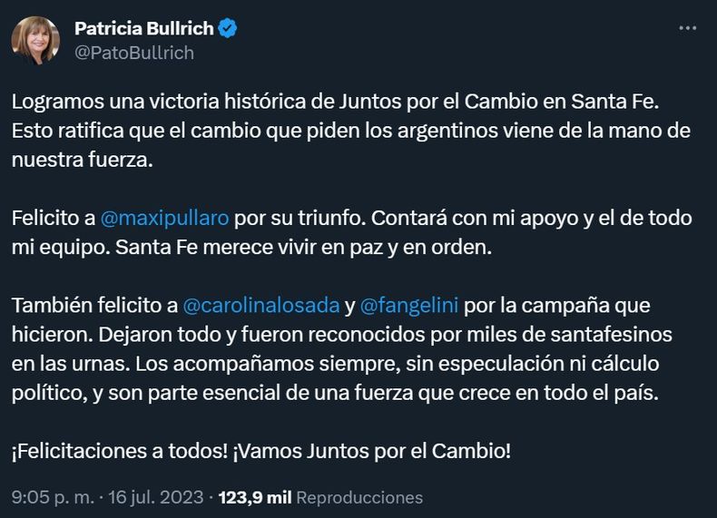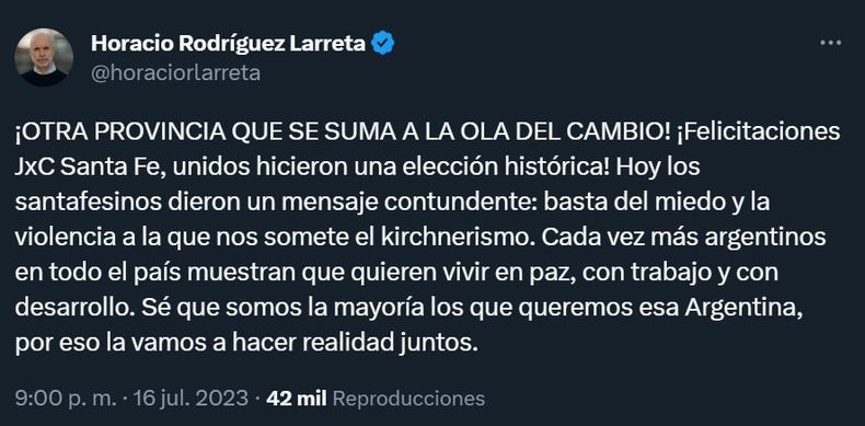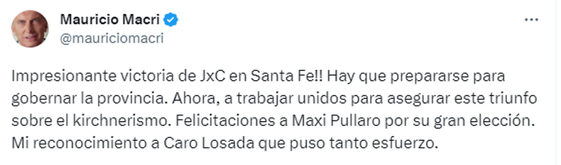El exmandatario celebró el triunfo de Maximiliano Pullaro, precandidato a gobernador en Santa Fe apoyado por Horacio Rodríguez Larreta: "Impresionante victoria de JxC en Santa Fe!! Hay que prepararse para gobernar la provincia. Ahora, a trabajar unidos para asegurar este triunfo sobre el kirchnerismo. Felicitaciones a Maxi Pullaro por su gran elección. Mi reconocimiento a Caro Losada que puso tanto esfuerzo".