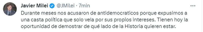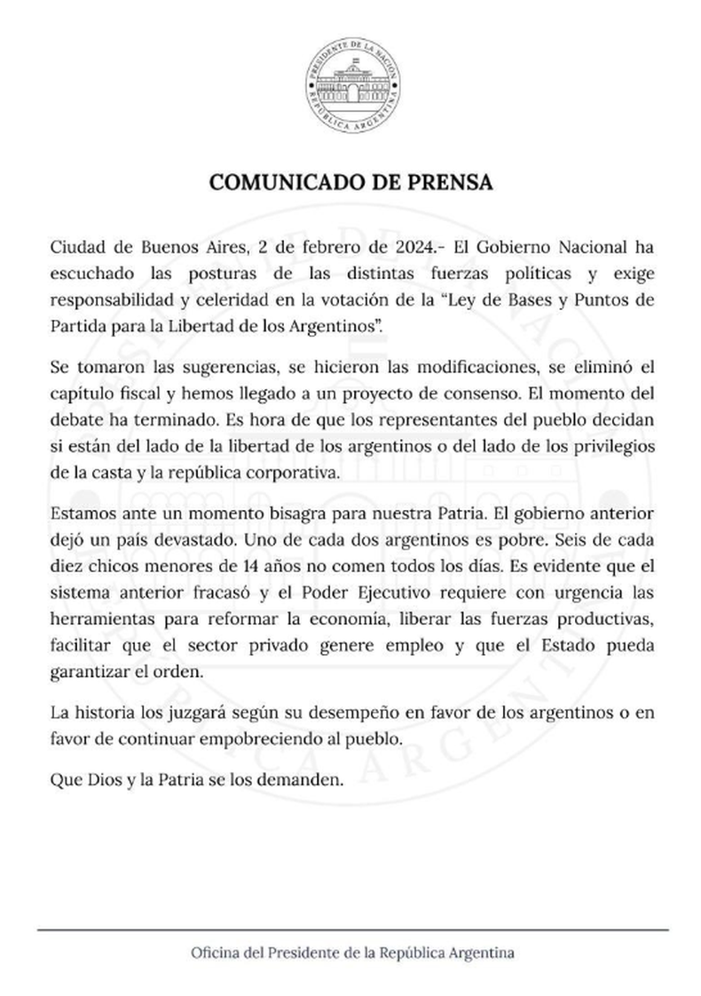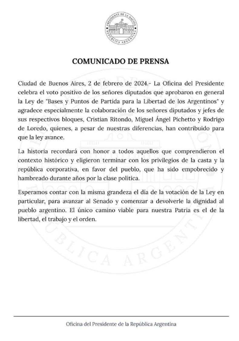 La Oficina de Presidencia compartió un comunicado para celebrar la votación, a nivel general, de la Ley Ómnibus en la Cámara de Diputados. "Agradecemos especialmente la colaboración de los señores diputados y jefes de sus respectivos bloques, Cristian Ritondo, Miguel Ángel Pichetto, Rodrigo de Loredo, quienes, a pesar de nuestras diferencias, han contribuido para que la ley avance".