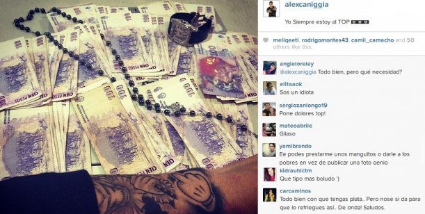 "Qué payaso por dios, terrible p... sos"; "Qué tipo más boludo"; "Todo bien con que tengas plata.. Pero no sé si da para que lo refriegues así.. De onda! Saludos";" Qué idiota que SOS haciendo eso!!! ¿¿De qué te sirve mostrar??"; "Poné dólares o algo que valga más. Eso no vale nada, bobo jajaja", fueron algunos de los mensajes que escribieron los usuarios junto a la foto.