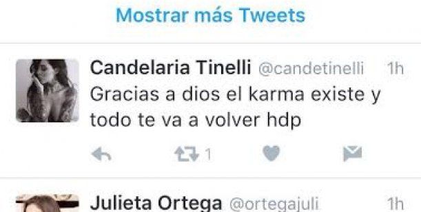 "Gracias a Dios el karma existe y todo te va a volver, hdp", escribió el domingo a la noche, aunque luego borró el tuit. En ese mismo momento marcó como Favorito un mensaje que rezaba "se llama Karma y se pronuncia 'eso te pasa por hdp'".