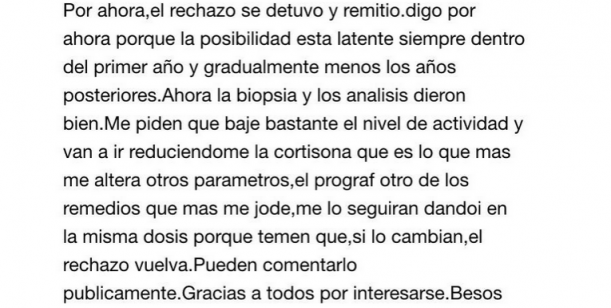 "Por ahora el rechazo se detuvo y remitió. Digo por ahora porque la posibilidad está latente siempre dentro del primer año y gradualmente menos los años posteriores. Ahora, la biopsia y los análisis dieron bien", comentó en un texto publicado en la web de Radio Mitre.