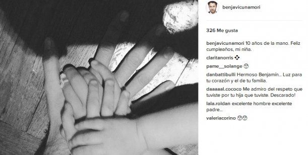 "10 años de la mano. Feliz cumpleaños, mi niña", escribió el actor chileno en su cuenta de Instagram este domingo junto a una foto en la que se ve una tierna postal familiar. En dicha imagen aparece su mano junto a las de sus hijos Bautista, Benicio y Beltrán.