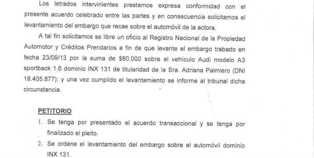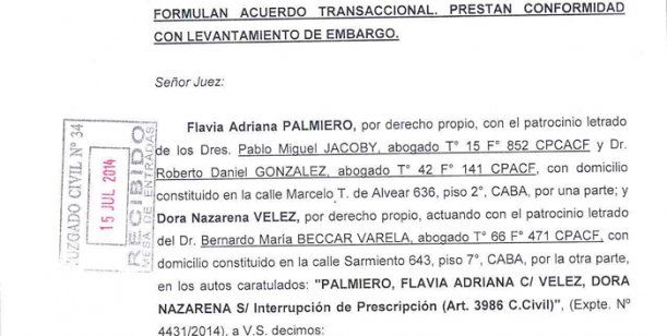 El documento, en una de sus partes, afirma que Flavia aceptó las disculpas de Nazarena: "La Sra. Flavia Palmiero acepta las disculpas del caso, y desiste de cualquier reclamo indemnizatorio en cuanto a los hechos ventilados en el presente litigio".
