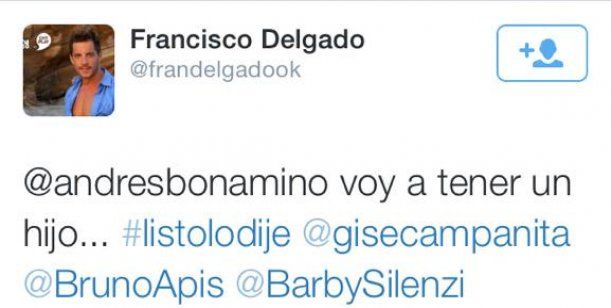 Por otro lado, mientras el productor estaba haciendo su descargo en vivo en Intrusos, le molestraron un tuit de Delgado del 11 de marzo de 2012, en donde anunciaba: "Voy a tener un hijo. Listo, lo dije". En dicho mensaje también arroba a Gisela Bernal, quien no respondió.