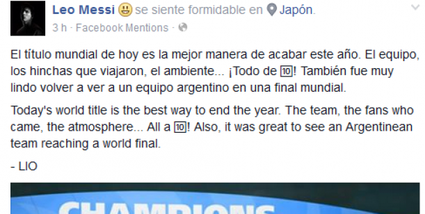 "El título mundial de hoy es la mejor manera de acabar este año. El equipo, los hinchas que viajaron, el ambiente... ¡Todo de ! También fue muy lindo volver a ver a un equipo argentino en una final mundial", escribió en castellano y en inglés el titular del equipo catalán en su cuenta de Facebook, seguida por más de 81.641.000 usuarios.