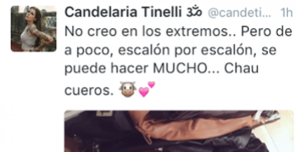 Un tuit llamó la atención, y generó polémica. En la foto se veían alrededor de cuatro camperas de cuero amontonadas en el piso, como decisión de no usarlas más. "No creo en los extremos. Pero de a poco, escalón por escalón, se puede hacer MUCHO. Chau cueros", contó.