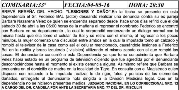 "En la fecha se presentó en esta dependencia el Sr. Federico BAL (actor) deseando realizar una denuncia contra su ex pareja Bárbara Nazarena Vélez de quien se encuentra separado desde hace unos días.