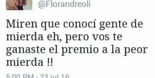 Según lo que se desprende de un tuit de Andreoli, la ruptura no se dio en buenos términos. "¡¡Miren que conocí gente de mierda, eh, pero vos te ganas el premio a la peor mierda!!", expresó la ex novia del cantante en la red social, aunque no aclaró de quién estaba hablando. La cuenta luego fue dada de baja, pero los usuarios hicieron una captura del mensaje.