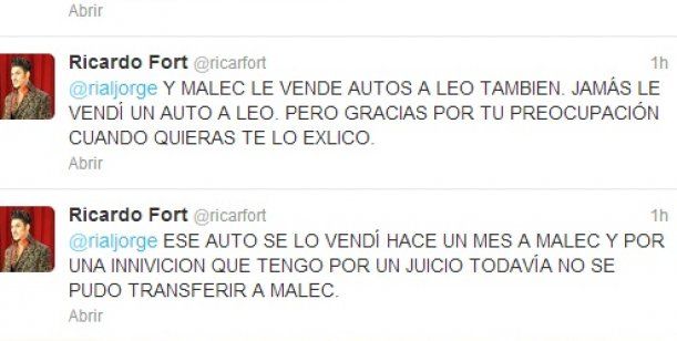 En una serie de tweets a Jorge Rial, Fort explicó que el auto estaba a su nombre pero lo vendió a "Malec", aunque no aclaró si es una persona física o una empresa, y que no pudo realizar la transferencia por una inhibición judicial.