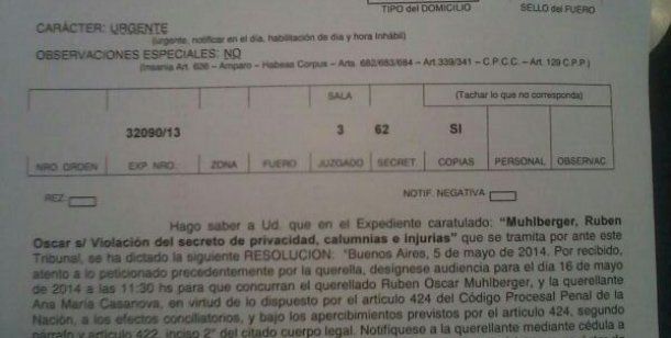 El 5 de mayo Mühlberger recibió la notificación de la audiencia para este viernes 16 de mayo a las 11:30 de la mañana, pero el médico no fue.