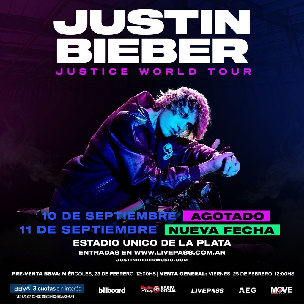 Justin Bieber llegará a Argentina para presentar su álbum Justice el 10 y 11 de septiembre de 2022 en el Estadio Único de La Plata, en el marco del Justice World Tour.
