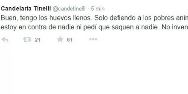 "Tengo los huevos llenos. Solo defiendo a los pobres animales. No estoy en contra de nadie, ni pedí que saquen a nadie. No inventen. Beso", afirmó en un tuit que después borró.