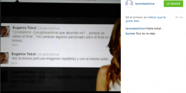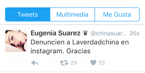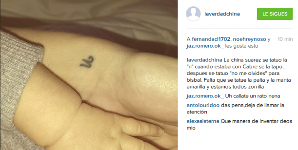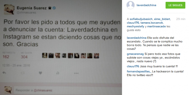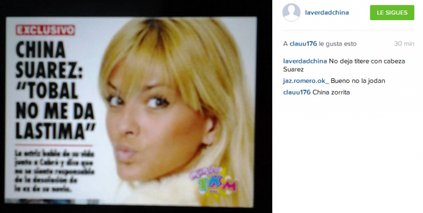 El usuario se llama La verdad china y postea fotos y frases a favor de Pampita y criticando a ella. "La china Suárez se tatuó la 'n' cuando estaba con Cabré se la tapo... Después se tatuó 'no me olvides' para Bisbal. Falta que se tatúe la palta y la manta amarilla y estamos todos zorrilla", es una de las frases que critica su historial amoroso.