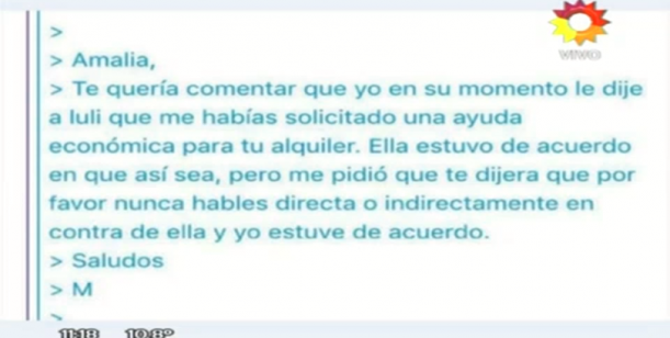 "Me da pena tener que contar una situación que la va a lastimar a Luciana, lo tenía reservado por respeto a la pareja pero cuando me empiezan a ensuciar... pongo las manos en el fuego que Martín no escribió ese mail, ese mail es trucho", indicó la mediática y aclaró: "No me ayudó para mudarme. Sería una extorción, Martín nunca se manejo así conmigo. La única vez que me prestó plata fue cuando yo tenía el auto en el mecánico y como no legaba a buscarlo, mandó a su chofer. Fueron 5 mil pesos y yo se los devolví".