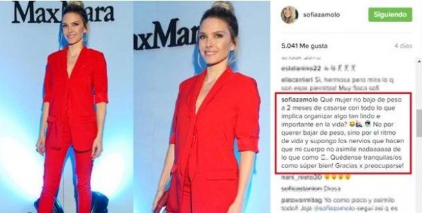 "¿Qué mujer no baja de peso a dos meses de casarse con todo lo que implica organizar algo tan lindo e importante en la vida? -se preguntó la rubia en una especie de descargo que escribió en su sitio, y luego borró-. No por querer bajar de peso, sino por el ritmo de vida y, supongo, los nervios, que hacen que mi cuerpo no asimile nadaaaaa de lo que como. Quédense tranquilas/os: ¡como súper bien! ¡Gracias por preocuparse!", fue la extensa explicación que dio Sofía Zámolo en las redes sociales.
