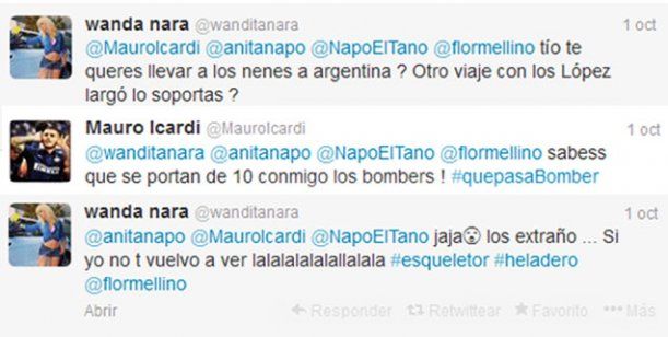 Luego aparece un cruce entre ellos en Twitter, donde los hijos de Wanda lo llaman "tío", y donde ella asegura "los vamos a extrañar". twitters wanda nara - icardi