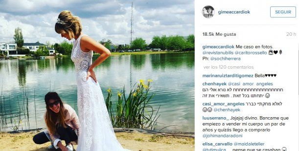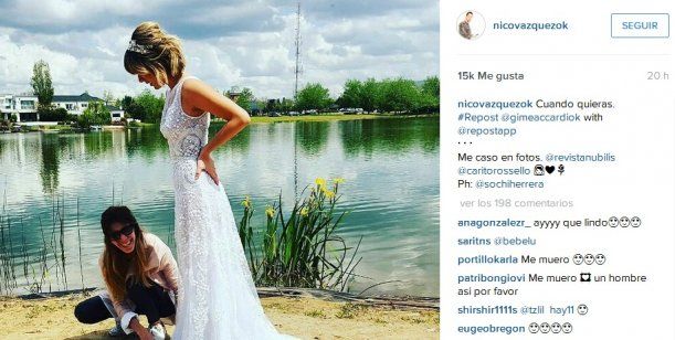 En esta ocasión, realizo fotos con un vestido de novia y, como era previsible, generó un rebote con su pareja Nico Vázquez. A la hora de publicar una foto del backstage de la producción, Accardi sugirió: "Me caso en fotos".