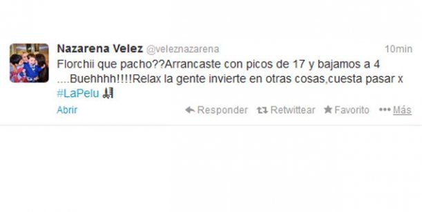 Y hoy Nazarena tuiteó el rating de Florencia De la V, de "La Pelu": "Florchii ¿qué pacho??Arrancaste con picos de 17 y bajamos a 4 ....Buehhhh!!!! Relax la gente invierte en otras cosas, cuesta pasar por La Pelu".