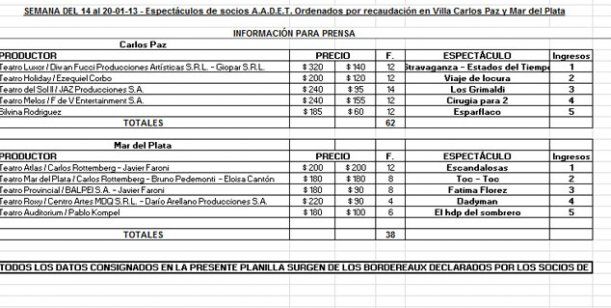 La Asociación Argentina de Empresarios Teatrales (AADET) divulgó la estadística de las obras más vistas en Mar del Plata y Villa Carlos Paz en la semana del 14 al 20 de enero.