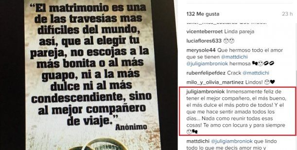 Muy enamorada, la modelo, quien se separó de Martínez en 2015, le respondió: "Inmensamente feliz de tener el mejor compañero, el más bueno, el más dulce el más potro de todos! Y el que me hace sentir amada todos los días... Nada como reunir todas esas cosas! Te amo con locura y para siempre".