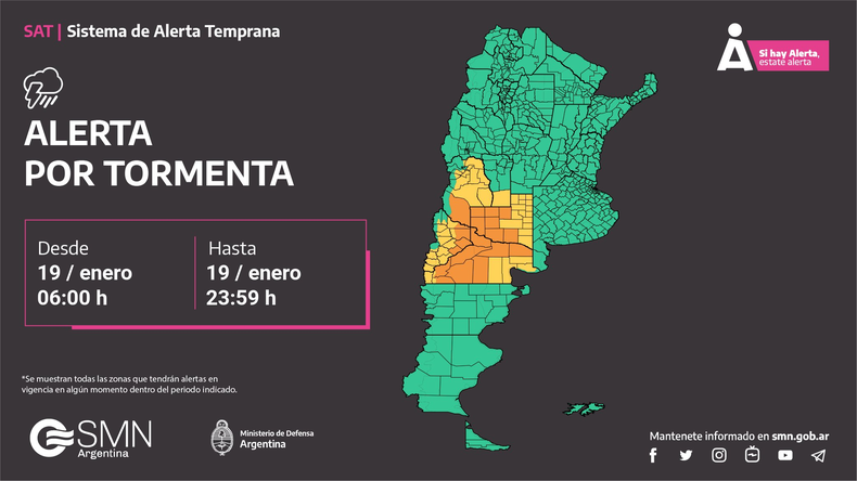 El Servicio Meteorológico Nacional (SMN) emitió una alerta por tormentas y granizo en más de 65 localidades de Argentina. El organismo aclaró que se espera abundante caída de agua en cortos períodos de tiempo, intensas ráfagas de viento e importante actividad eléctrica. Las provincias afectadas son: Chubut, La Pampa, Neuquén, San Luis y Mendoza.