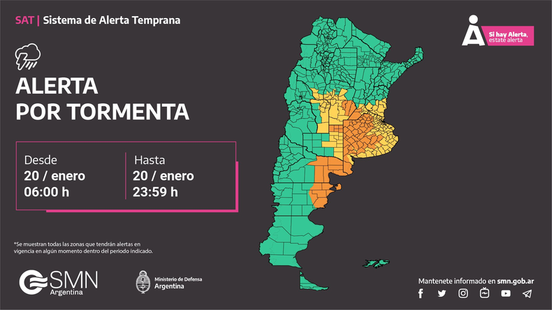 El Servicio Meteorológico Nacional (SMN) emitió una alerta meteorológica naranja por tormentas en Buenos Aires y más de 40 localidades de Argentina. El organismo prevé precipitaciones localmente fuertes y ocasional caída de granizo. Las provincias afectadas son: Chubut, Río Negro, La Pampa, San Luis, La Rioja, Córdoba, Santa Fe, Entre Ríos y Buenos Aires.