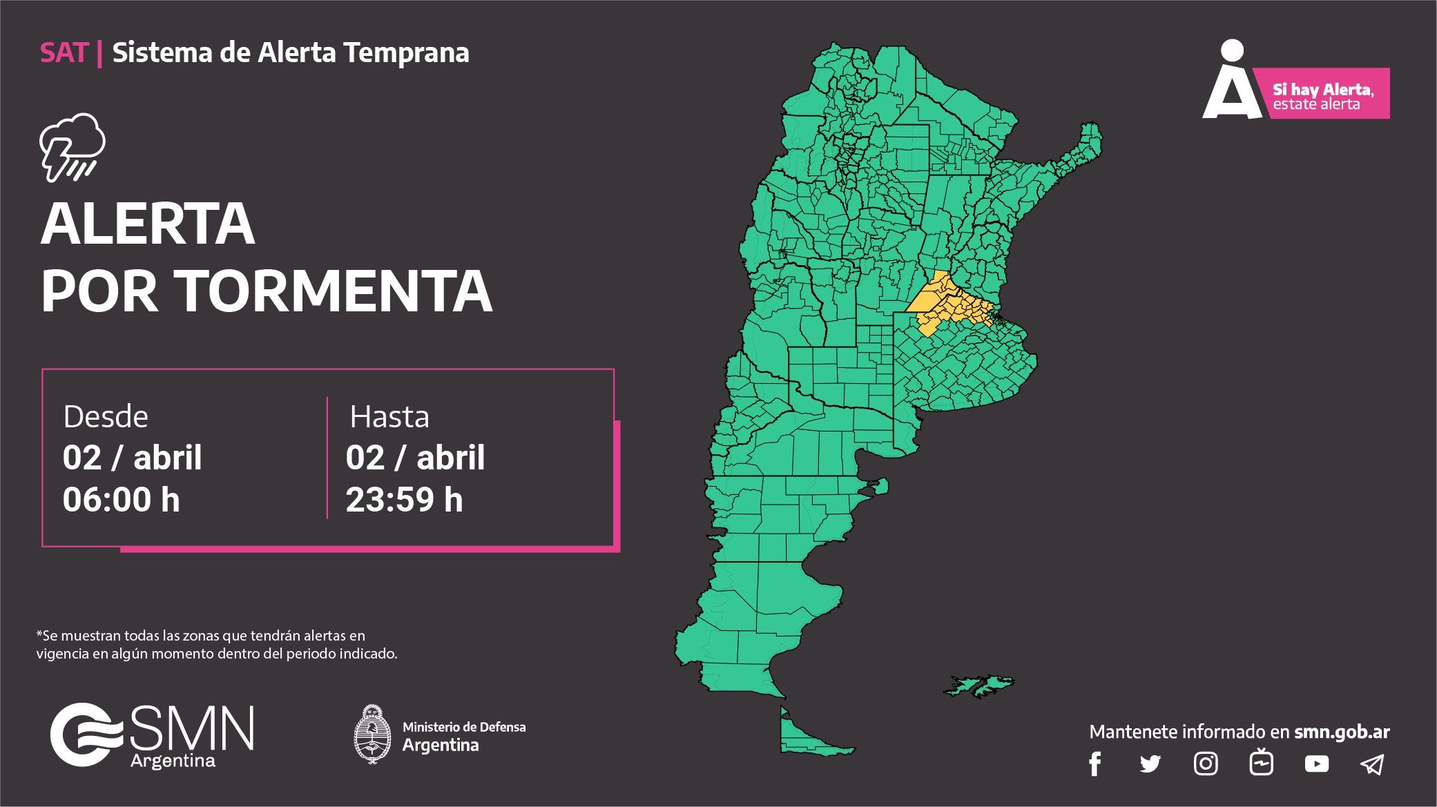 El Servicio Meteorológico Nacional (SMN) emitió un alerta amarilla por tormentas este domingo para el norte de la provincia de Buenos Aires y el sur de Santa Fe. El área será afectada por tormentas de variada intensidad, algunas localmente fuertes con abundante caída de agua en cortos periodos, caída de granizo, fuerte actividad eléctrica y ráfagas.