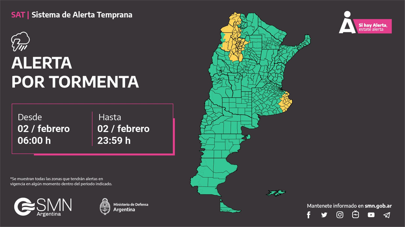 El Servicio Meteorológico Nacional (SMN) emitió una alerta meteorológica amarilla por tormentas en Buenos Aires y en más de 40 localidades de Argentina. Se espera abundante caída de agua en cortos períodos y fuerte actividad eléctrica. Las provincias afectadas son: Buenos Aires, La Rioja, Catamarca, Tucumán, Salta y Jujuy.