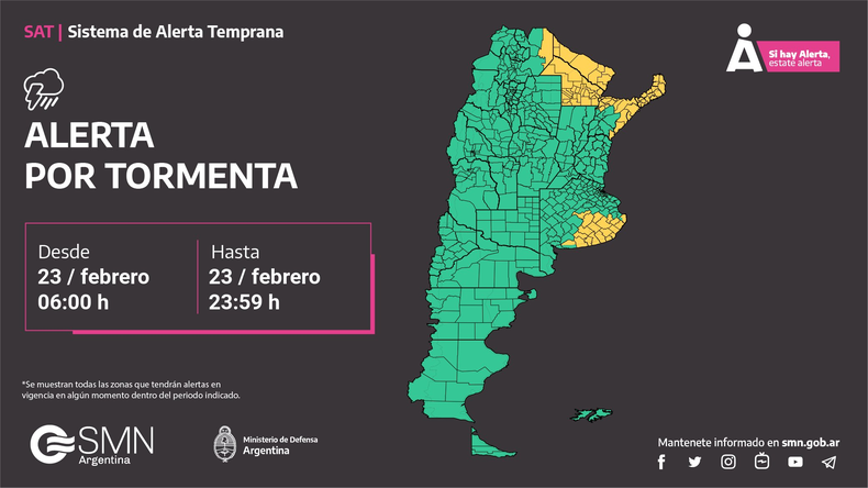 El Servicio Meteorológico Nacional (SMN) emitió una alerta meteorológica por tormenta en Buenos Aires y más de 45 localidades de Argentina. El aviso rige para las provincias de Buenos Aires, Corrientes, Misiones, Chaco y Formosa. Se espera precipitaciones de variada intensidad, acompañadas por, fuerte actividad eléctrica y abundante caída de agua.