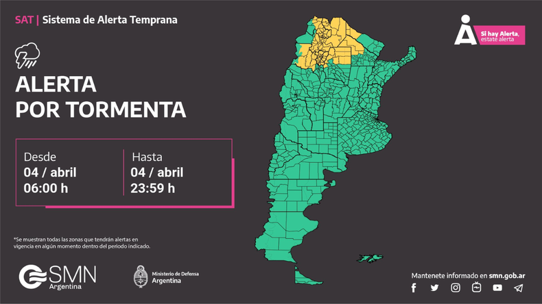 El Servicio Meteorológico Nacional (SMN) emitió una alerta meteorológica amarilla por tormentas en más de 60 localidades de Argentina. El organismo comunicó que las provincias de Santiago del Estero, Tucumán, Catamarca, Salta, Jujuy, Salta, Chaco y Formosa, se verán afectadas por lluvias localmente intensas, acompañadas por fuerte actividad eléctrica.