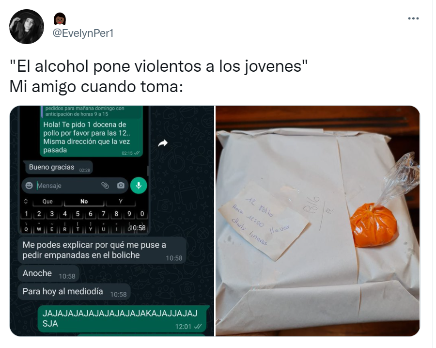 “Me podés explicar por qué me puse a pedir empanadas en el boliche. Anoche. Para hoy al mediodía”, le escribió el joven, junto a un screenshot en el que evidenció que encargó una docena de pollo a las 2 de la madrugada, pero para las 12 del mediodía.